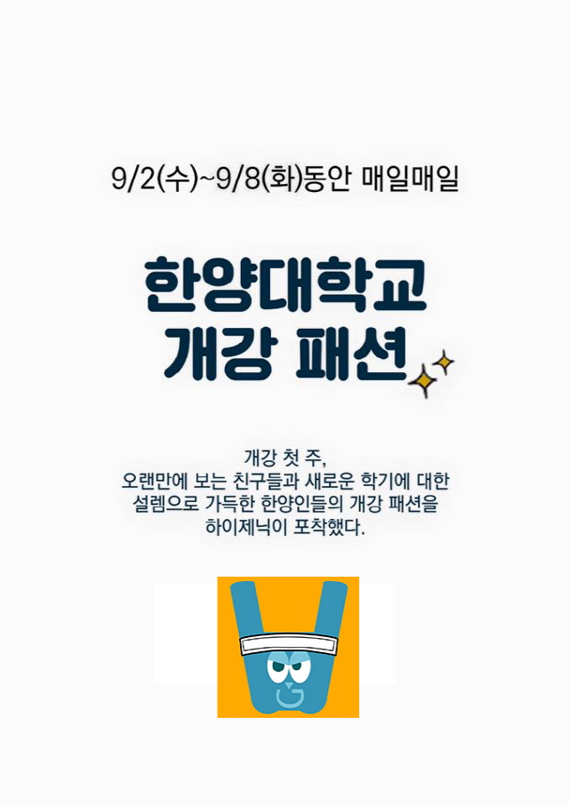 여름과 가을을 넘어가는 절묘한 시즌, 개강은 그렇게 패션피플에게도 남다른 때인것 같습니다. 한양대학생들의 2학기 개강 패션은 어떨까요? 캠퍼스 구석구석을 돌아다니며 한양의 패션 남녀들을 만난 '하이제닉'이 개강 패션 사진들을 공개했습니다. 하이제닉 페이스북 페이지에서는 5일간 총 19명의 모델들이 소개되었고,한양대 대표계정에서는 19장의 대표사진을 공유했습니다. 어떤 패션이 가장 마음에 드시나요? 하이제닉 페이지를 통해서 각 의상과 악세사리에 대한 세부 설명도 볼 수 있습니다.