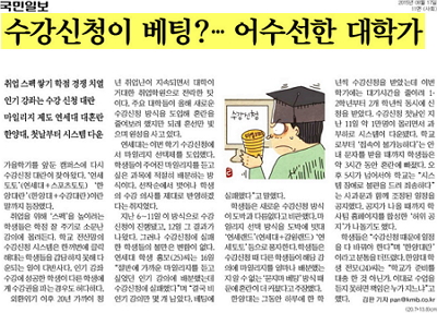 17일자 <국민일보>에는 대학가에 찾아온 수강신청 대란에 대한 기사가 게재되었습니다. 주요 대학들이 수강신청 혼란을 줄이려 새로운 수강신청 방식을 도입했지만 되레 혼선만 빚었다는 내용인데요. 한양대도 하루에 한 학년씩 수강신청을 받다가 올해부터 2개 학년씩 동시에 신청을 받는 것으로 변경하면서 수강신청 첫날 약 1만명이 몰려 시스템이 다운되는 일이 발생했습니다. 이로 인해 학생들의 항의가 빗발쳤고, 학교측은 사과문과 함께 조정된 일정을 공지했습니다.