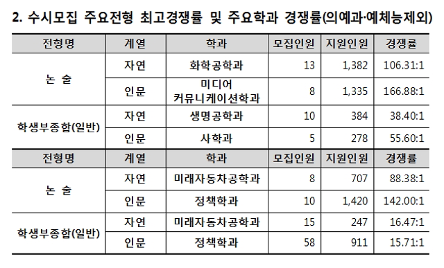 전체 경쟁률 현황, 주요전형 최고경쟁률 및 주요학과 경쟁률 등