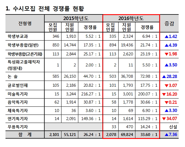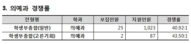 특히 올해 논술 전형의 경쟁률은 72.98대 1로 작년과 비교해 폭등했다. 논술 전형은 모집 학과 44개 가운데 13개 학과가 100대 1이 넘는 경쟁률을 보이며 가파른 상승세를 보였다.