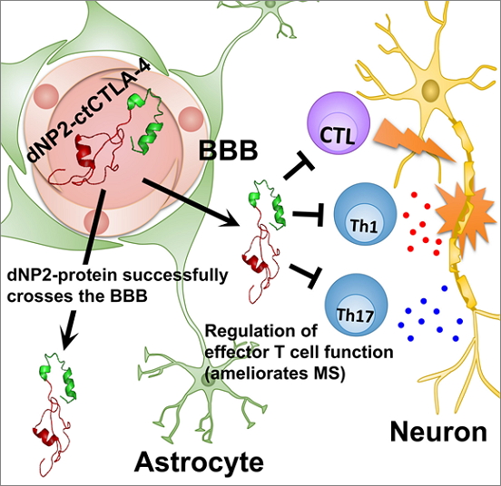 이번에 개발된 물질은 인간 단백질 유래의 아미노산 서열을 활용해 안전하며 우리 몸에 자연적으로 존재하는 펩타이드를 이용한 dNP2 및 뇌혈관장벽 투과 및 치료 단백질인 ctCTLA-4단백질의 성공적 전달을 통해 자가면역질환의 주요 인자인 T세포의 기능을 효과적으로 조절할 수 있었다. 그 결과 면역작용에 의한 신경세포의 사멸 및 교란에 의한 운동장애, 하반신마비와 같은 증상이 완화되고 뇌조직내 침윤된 염증세포가 현저히 감소함을 확인했다. 다발성 경화증은 전 세계적으로 약 200만명 이상의 환자가 보고되고 있으며, 근본적 치료제가 없는 미충족 의료수요가 매우 높은 질병이다.