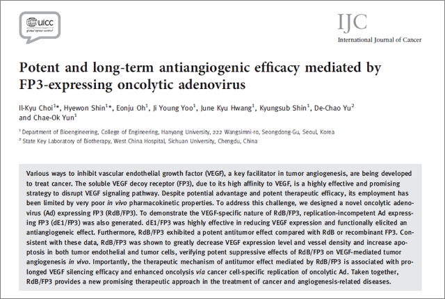 신 씨의 논문은 종양세포의 새로운 혈관을 만드는데 필요한 물질인 VEGF(Vascular Endothelial Growth Factor: 혈관내피세포성장인자)를 억제할 수 있는 재조합 수용체(FP3: VEGF decoy receptor)를 발현하는 종양 특이적 살상 아데노바이러스의 개발과 실제 종양에 대한 그 효과의 검증에 관한 것이다.