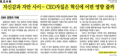2일자 <동아일보>에는 류주한 국제학부 교수가 '경영진의 자만이 기업 성과에 미치는 영향'에 대한 기고글을 전했습니다. 류 교수는 "최고경영진의 지나친 자신감과 자만이 반드시 성과에 해를 끼치는 것만은 아니라는 연구 결과가 나왔다"며 "혁신과 변화를 추구하는 기업이라면 오히려 경영진의 자기애적 과대망상이 혁신 성과에 큰 도움이 된다는 주장이다"라고 소개했는데요. 그는 홍콩대 연구진의 연구결과를 설명하며 "그러나 연구자들이 지적한 대로 경영자들은 요즘처럼 한 치 앞도 내다보기 어려운 환경에서 강한 확신과 방심, 그리고 자신감에 찬 도전과 산만함의 경계를 명확히 구분할 줄 알아야 한다"고 조언했습니다.