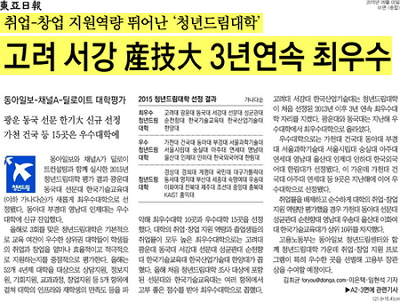 9월 2일자 <동아일보>에는 동아일보-채널A-딜로이트컨설팅이 함께 실시한 '2015년 청년드림대학 평가' 결과가 전해졌습니다. 청년드림대학은 대학들이 학생들의 취업과 창업을 얼마나 효율적이고 적극적으로 지원하는지를 평가해 선정하는데요. 한양대는 취업·창업 지원 역량과 졸업생들의 취업률에서 모두 높은 점수를 받아 '최우수 청년드림대학'으로 선정되었습니다.