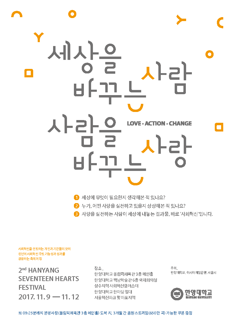 올해로 두 번째 열리는 이번 축제는 ‘세상을 바꾸는 사람, 사람을 바꾸는 사랑’이라는 슬로건 아래 열린다. 유엔의 17가지 지속가능개발목표(SDGs)와 한양대학교의 건학이념인 ‘사랑의 실천’ 이행을 위해 개최되는 본 축제는 아시아·태평양지역 청년들이 모여 지속가능한 사회 실현을 위한 혁신 아이디어를 제안하고 공동 창업을 통해 아이디어를 실현하는 기회의 장으로 마련된다.