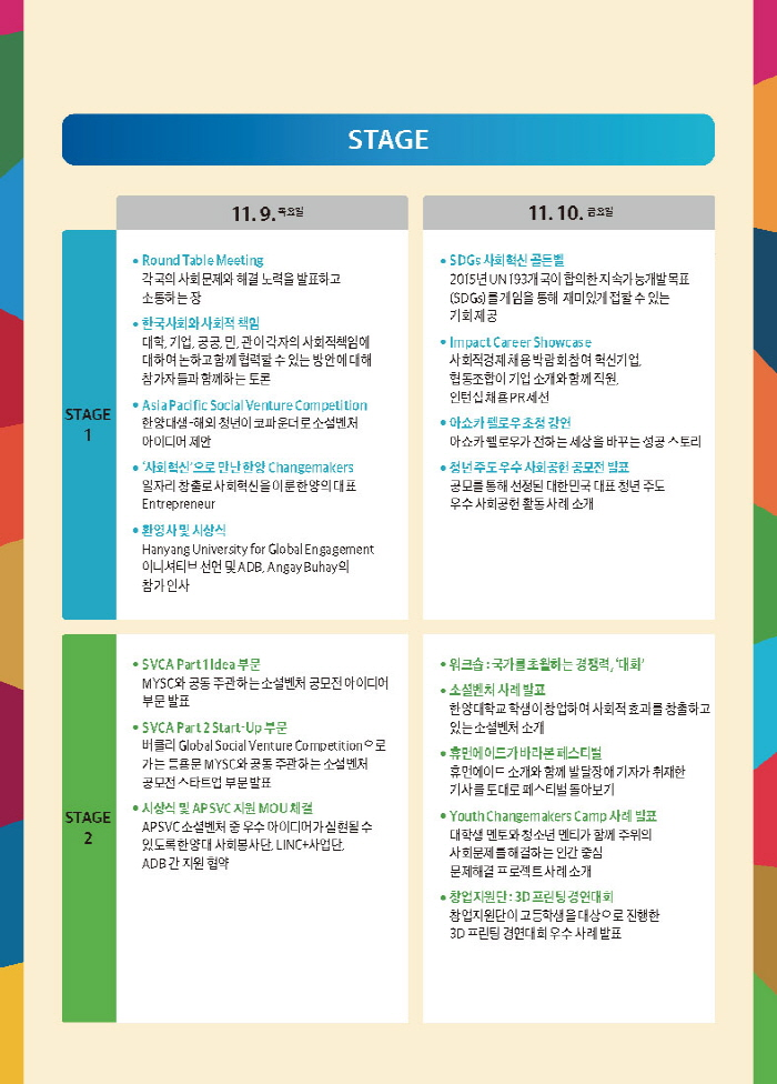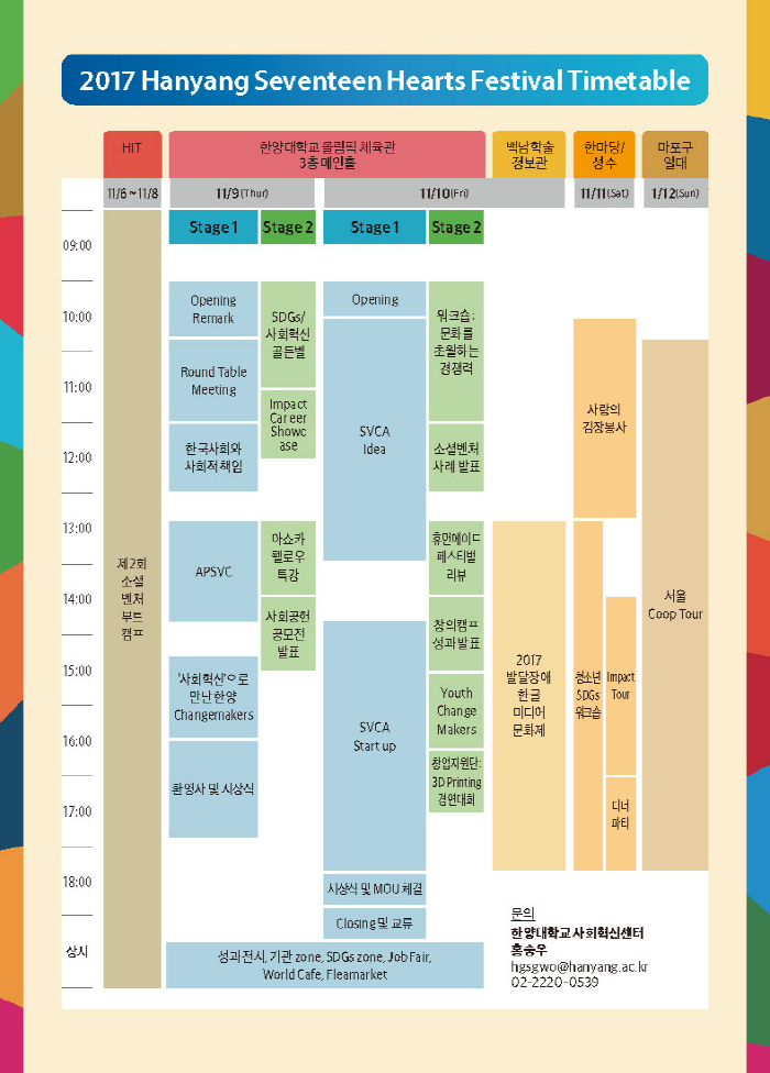 10일(금)은 △MYSC와 공동 주관하는 소셜벤처 공모전 발표 및 시상식 △한양대 사회봉사단, LINC+사업단, ADB 간 지원 협약식(MOU) △한양대 학생이 창업해 사회적 효과를 창출하고 있는 소셜벤처 사례 발표 △2017 발달장애 한글미디어문화제 △발달장애 기자가 바라본 페스티벌 △3D프린팅 창업아이템 콘테스트 △Youth Changemakers Camp 등이 열린다.
