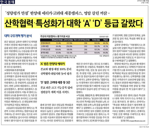 5일자 <한국경제>에는 최근 교육부 대학구조개혁 평가에서 한양대 에리카캠퍼스가 A등급을 받았다는 소식이 전해졌습니다. 기사는 타 대학의 지방캠퍼스와 달리 에리카캠퍼스만 높은 평가를 받은 이유에 대해 본교와 차별화되는 자체적인 특성화 노력과 정원 및 학과 구조조정 등 개혁에 대한 의지 덕분이라고 분석했는데요. 원호식 에리카캠퍼스 기획처장은 "학생들을 위한 창업 및 취업지원을 충실히 한 게 도움이 됐다"고 말했습니다.