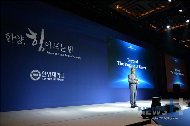 | ▲ 한양대 이영무 총장이 ‘Beyond the engine of korea’을 주제로 비전 발표 스치피를 하고 있다.(이미지출처: 대외협력팀 발전기금 블로그) | ||