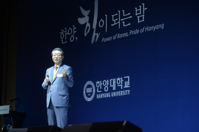 | ▲ 한양대 이영무 총장이 ‘Beyond the engine of korea’을 주제로 비전 발표 스치피를 하고 있다. | ||