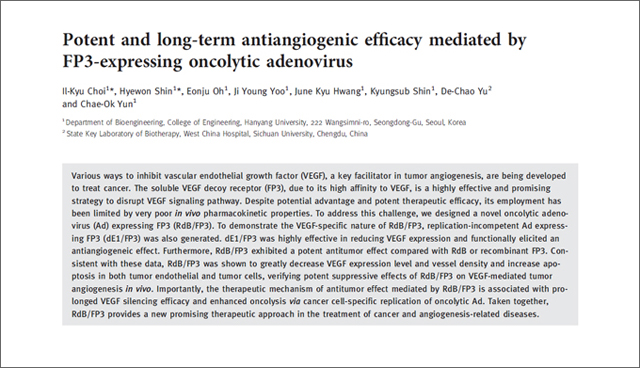 신경섭(공과대 생명공학3) 씨가 공저자로 쓴 논문이 SCI(과학기술논문인용색인)급 국제 학술지에 게재됐다. 논문이 실린 ‘인터내셔널 저널 오브 캔서(International Journal of Cancer)’는 암 분야에서 최상급의 권위를 가진 학술지다. 신 씨의 논문은 종양세포의 새로운 혈관을 만드는데 필요한 VEGF(Vascular Endothelial Growth Factor)라는 혈관내피세포성장인자를 억제하는데 도움을 주는 아데노바이러스(adenovirus)의 개발과 실제 그 효과 검증에 대한 것이다. 이번 연구에서 신 씨는 종양세포에서만 선택적으로 작용하는 아데노바이러스(adenovirus)를 제작했다. 또한 이러한 아데노바이러스가 강력한 종양 내 혈관 형성억제효과와 종양제거 효과를 갖는 것을 확인해 새로운 형태의 암 치료제 개발의 가능성을 열었다.