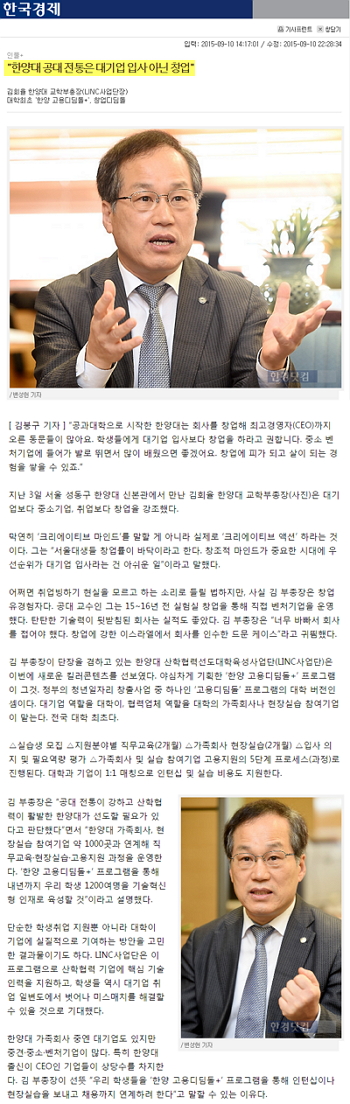 9월 10일자 <한국경제>에는 김회율 교학부총장 겸 LINC사업단장의 인터뷰가 전해졌습니다. 김 부총장은 "공과대학으로 시작한 한양대는 회사를 창업해 CEO까지 오른 동문들이 많다. 학생들에게 대기업 입사보다 창업을 하라고 권한다. 중소 벤처기업에 들어가 발로 뛰면서 많이 배웠으면 좋겠다. 창업에 피가 되고 살이 되는 경험을 쌓을 수 있을 것"이라고 말했는데요. 그는 LINC사업단이 이번에 새롭게 선보인 '한양 고용디딤돌+' 프로그램을 소개하며 "한양대 가족회사, 현장실습 참여기업 약 1000곳과 연계해 직무교육·현장실습·고용지원 과정을 운영한다. '한양 고용디딤돌+' 프로그램을 통해 내년까지 우리 학생 1200여명을 기술혁신형 인재로 육성할 것"이라고 말했습니다.