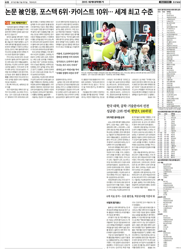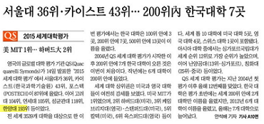 9월 15일자 <조선일보>에는 '2015 QS 세계대학평가' 결과가 전해졌습니다. 이번 평가에서 한양대는 지난해 대비 26계단이나 상승해 193위에 이름을 올리며 100원권 대에 진입했는데요. 5개 학문 분야에서 전체적으로 상승세를 보였지만 특히 공학·기술 분야에서는 67위를 차지하며 두각을 나타냈습니다 또한 지표별 평가에서는 '외국인 학생 비율'에서 263위를 차지해 국내 대학 중 가장 높은 순위를 보였습니다.