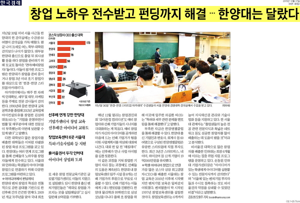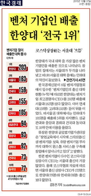 10월 7일자 <한국경제>에는 '벤처기업 CEO 출신 대학 1위', '코스닥 상장사 CEO 출신 대학 2위'를 기록한 한양대의 차별화된 창업 육성 프로그램에 대한 내용이 전해졌습니다. 기사는 한양대 벤처 창업의 특징이 전통적으로 강한 공대를 기반으로 한 선후배 간의 끈끈한 연계라고 분석했는데요. 글로벌기업가센터 설립, 창업경진대회 '라이온컵 컴피티션', '한양 스타트업 아카데미' 등을 통해 선배 기업가들이 창업을 준비하는 후배들을 이끌어주면서 이같은 성과를 보일 수 있었다고 합니다.