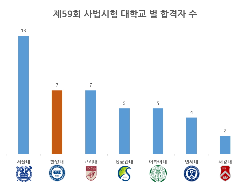 가장 많은 합격자를 낸 대학은 서울대(13명)로 전체 합격자 중 23.64%를 차지했다. 이어 한양대 7명(12.73%) △고려대 7명(12.73%) △성균관대 5명(9.09%) △이화여대 5명(9.09%) △연세대 4명(7.27%) △서강대 2명(3.64%) 순으로 나타났다.