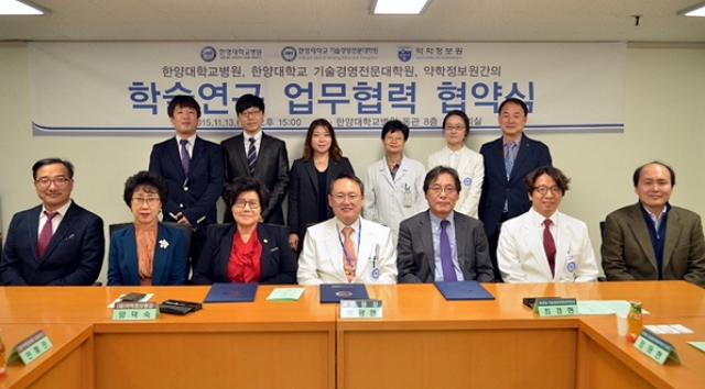 | ▲ 한양대병원은 한양대 기술경영전문대학원 및 약학정보원과 ‘약학정보 공유 기술 개발을 위한 업무협약’을 체결했다.(이미지출처: 한양대병원) | ||