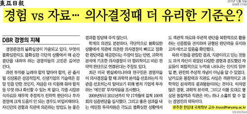 2일자 <동아일보>에는 류주한 국제학부 교수가 '경영자들이 의사결정을 할 때 더 유리한 기준'에 대한 기고글을 전했습니다. 류 교수는 미국 펜실베이니아대 연구진의 조사 결과를 소개하며 경영자들이 의사결정을 할 때 과학적 분석과 직관 중 어느 것을 더 선호하는지에 대해 알아보았는데요. 그는 "좋은 성과를 내는 투자자들은 극도로 불확실한 상황에서도 객관적 자료와 주관적 판단을 복합적으로 활용하는 신중함을 견지하며 균형된 판단력을 유지하고자 애쓰고 있음을 확인했다"고 말했습니다.