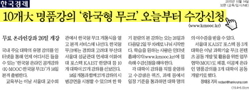 10월 14일자 <한국경제>에는 주요 대학의 유명 강의를 온라인으로 언제든 들을 수 있는 '한국형 무크'가 수강신청을 시작했다는 내용이 전해졌습니다. 앞으로 한국형 무크를 통해서 한양대를 포함해 서울대, 연세대, 고려대, 성균관대 등 10개 대학이 27개 강좌를 선보일 예정인데요. 수강생은 수업을 듣고 과제와 퀴즈 등에서 기준을 통과하면 해당 대학 명의의 이수증을 받을 수 있다고 합니다.