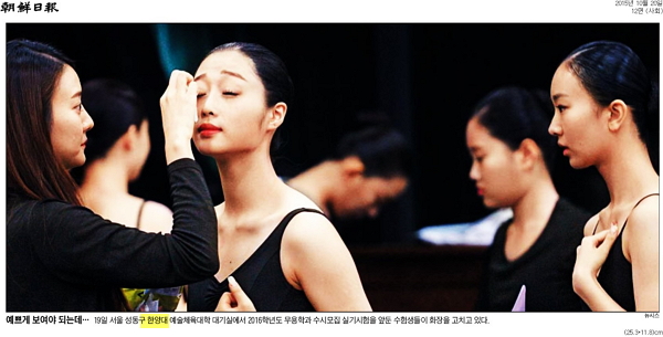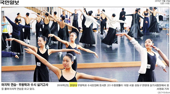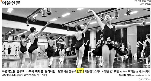 10월 20일자 <국민일보>, <조선일보> ,<서울신문>, <서울경제>에는 19일 열린 2016학년도 한양대 무용학과 수시 실기고사 현장이 전해졌습니다. 기사에는 시험을 앞둔 수험생들이 마지막 연습에 임하는 모습 등이 실렸습니다.