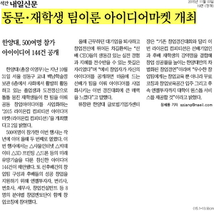 11월 4일자 <내일신문>에는 한양대가 '2015 라이온컵 컴피티션 아이디어 마켓'을 개최했다는 소식이 전해졌습니다. 라이온컵 컴피티션 아이디어 마켓은 사회에서 활동하는 졸업생과 아이디어로 똘똘뭉친 재학생들이 한 팀을 이뤄 창업아이디어를 사업화하는 프로그램인데요. 류창완 글로벌기업가센터장은 "기존 창업경진대회와 달리 이번 라이온컵 컴피티션은 선배기업인과 후배 재학생의 강약점을 결합해 창업 성공률을 높이는 한양대만의 차별화된 창업경연"이라고 소개했습니다.