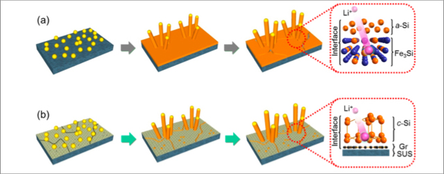 | ▲ 박원일 교수 연구팀은 음극 재료의 손상을 최소화하기 위해, 실리콘의 표면에 흑연의 한 면인 그래핀을 성장시키는 방법을 사용했다. | ||