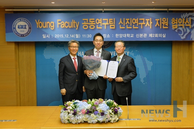 | ▲ 사진 왼쪽부터 성태현 교수(중견연구자), 김영범 교수(신진연구자), 이영무 한양대 총장이 14일 신진연구자 지원 협약식을 마친 후 기념촬영을 하고 있다. | ||