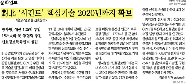 7일자 <문화일보>에는 방위사업청에서 한양대에 '신호정보특화연구센터'를 설립했다는 소식이 게재되었습니다. 방위사업청에서는 이를통해 다양한 형태의 신호정보를 수집·분석·처리하고 사용자가 인지할 수 있도록 복원하는 핵심기술을 2020년까지 확보하겠다고 전했습니다.