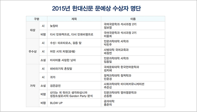 2015년 제48회 한대신문 문예상(이하 문예상)에는 시 50편, 소설 15편, 비평 6편이 출품됐다. 대상의 영예는 정보영(일반대학원 국어국문학 석사과정) 씨의 시 <늦장마>와, 이융희(일반대학원 국어국문학 석사과정) 씨의 비평 <다시 만화책으로, 다시 만화비평으로>에게 돌아갔다. 정 씨는 “필리핀 여행에서 본 아이들의 모습을 시에 담았다”고 자신의 작품을 소개했다. “가난에 관해 이야기하고 싶었어요. 물질적으로 풍요롭지 않아도 즐겁게 노는 아이들을 보면서 부유함과 가난함을 나누는 기준이 무엇인지 고민하게 됐어요. 가난과 자본의 역설에 대해 저는 너무 늦게 깨달음을 얻었다고 생각해서 제목을 <늦장마>라고 지었습니다.” 심사위원 유성호 교수(인문과학대 국어국문학과)는 정 씨의 작품이 “구체성 있는 언어를 시의 밑거름으로 삼으면서도, 그것을 짧은 호흡 속에 서정적으로 구성하는 만만찮은 능력을 보여줬다”고 평했다.