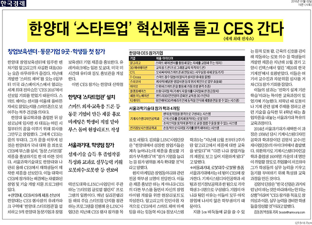1월 2일 <한국경제>에서는 한양대가 CES 행사장 유레카파크 구역에 '한양대 스타트업관'을 설치하고 9개 한양대 동문기업과 창업 보육센터 기업 제품을 홍보한다는 소식이 전해졌습니다. 이번 CES 참가는 한양대 산합협력선도대학 사업단이 주관하는 '스타트업 글로벌 챌린지' 프로그램의 일환이라고 합니다. 김회율 LINC사업단장은 "한양대에서 성장한 창업가들은 계속 늘어나는데 제품을 홍보할 기회가 부족했다"며 "참가 기업을 늘리는 등 참가 범위를 계속 확대할 것"이라고 말했습니다.