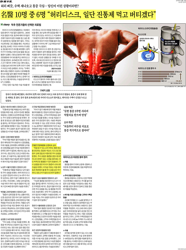 1월 13일 <조선일보>에는 척추 전문가들이 선택한 허리디스크 치료법에 대한 내용이 전해졌습니다. 허리디스크는 국내에서 입원 환자가 가장 많은 질병이지만 의사들마다 치료방법에 대한 견해가 달라 어떤 치료를 받아야 할지 판단하기 어려운 경우가 많다고 합니다. 전형준 의학과 교수는 "잠을 잘 수 있느냐의 여부는 통증 정도를 판단하는 중요한 척도다. 디스크로 통증이 심해 잠을 못 이룬다면 주사 요법을 받겠다. 주사 요법은 통증을 경감시킬 뿐 아니라 문제가 있는 신경을 찾아내는 진단 목적으로 활용할 수 있어 유용하다. 주사 요법을 받은 뒤 다시 통증이 나타나면 수술을 하겠다"고 말했습니다.