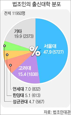 이번 조사 결과에 따르면 서울지역 대학 출신 법조인은 1만7백21명(89.7%)이며 지방 대학 출신은 1천91명(9.1%)이다. 또한 이중 본교를 포함한 서울 소재 5개 대학출신이 지금까지 배출된 법조인의 80퍼센트를 차지하고 있는 것으로 나타났다. 반면, 법조인의 출신 고등학교에서는, 1만9백25명 중 서울 출신이 3천5백15명(32.2%)에 그친 반면, 서울 이외 지역 출신이 6천7백67명(61.9%)으로 두 배 가량 더 많은 것으로 나타났다. 이처럼 출신 고등학교로는 서울 이외의 지역이 훨씬 많은데도, 법조인의 80퍼센트를 서울시내 5개 대학 출신이 차지해 ‘서울 일부 대학이 지방 출신 우수 인재를 독점하기 때문’이라는 지적이 일고 있다.