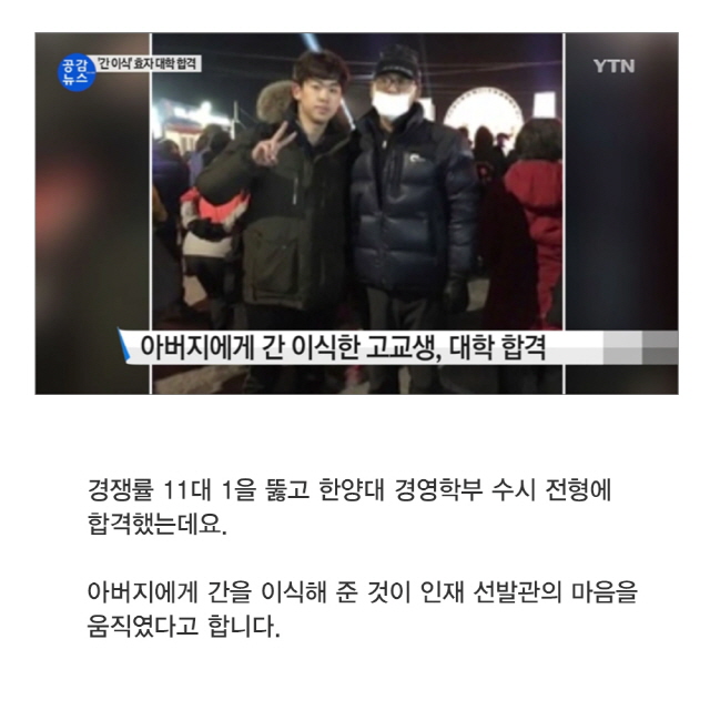 최근 언론 기사를 통해 한양대 입학 합격 사례가 소개되었는데요, 그 주인공은 바로 아버지에게 자신의 간을 떼어준 효자. 그 사연을 소개합니다.