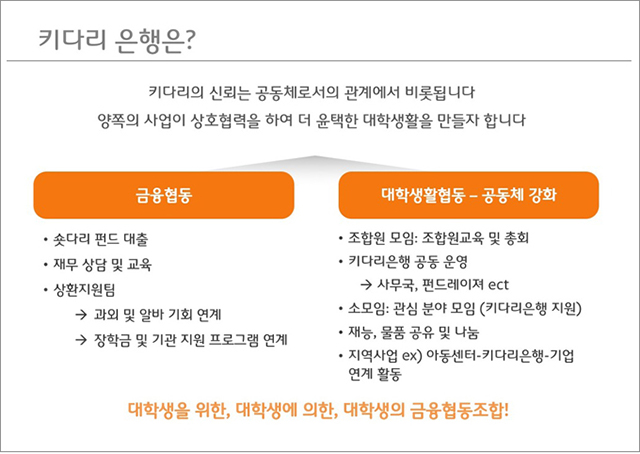 | ▲ 키다리은행은 학생들의 참여를 통해 경제적 어려움을 분담하고, 나아가 건강한 학생사회를 만들고자 한다. | ||