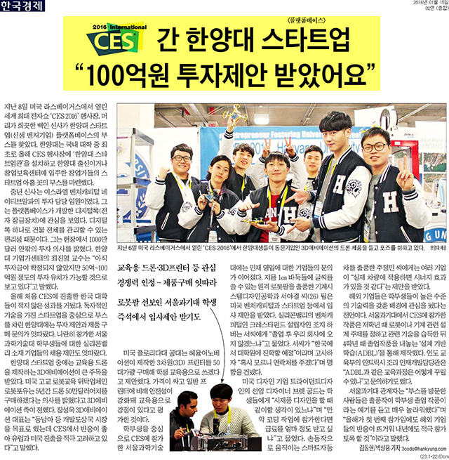 1월 15일 <한국경제>에서는 미국 라스베이거스에서 열린 세계 최대 전자쇼 'CES 2016'에 참가한 한양대 소식이 전해졌습니다. 한양대는 국내 대학 중 최초로 CES 행사장에 '한양대 스타트업관'을 설치하고 한양대 출신이거나 창업보육센터에 입주한 창업가들의 스타트업 부스를 마련했는데요. 독자적인 기술을 가진 스타트업을 중심으로 부스를 차린 한양대에 투자 제안과 제품 구매 문의가 잇따랐다고 합니다. 최진영 LINC사업팀 교수는 "아직 투자금이 확정되지 않았지만 50억~100억원 정도의 투자 유치가 가능할 것으로 보고 있다"고 전했습니다.