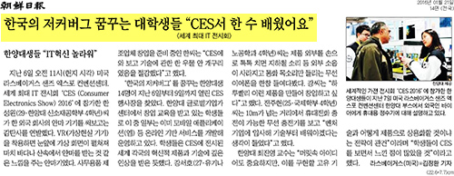 1월 21일 <조선일보>에는 한양대 글로벌기업가센터에서 창업 교육을 받고 있는 학생들이 'CES 2016'에 참가했다는 소식이 전해졌습니다. CES에 참가한 학생들은 전시된 세계 각국의 혁신적 제품과 기술에 깊은 인상을 받았다고 하는데요. 최진영 LINC사업팀 교수는 "머릿속 아이디어도 중요하지만, 이를 구현할 고유 기술과 어떻게 제품으로 상용화할 것이냐는 전략이 관건"이라며 "학생들이 CES를 보면서 느낀 점이 많았을 것"이라고 말했습니다.