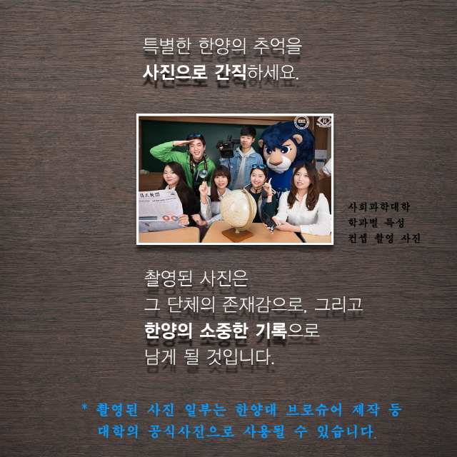 한양대 캠퍼스에 사진관이 문을 열었습니다. 하지만 실제 사진관을 연 것은 아니고, 사진 찍어주는 서비스를 개시한 것이죠. 한양브랜드서포터즈 사진팀은 교내 학생 단체들의 신청을 받아 선정한 뒤, 단체 사진 또는 컨셉 사진을 촬영해준다고 밝혔는데요. 일상적인 캠퍼스에서의 생활이지만 촬영을 위해 동아리나 학회, 학과 등에서 모이고 컨셉을 만들면서 나름 색다른 추억을 만들 것이라 기대가 됩니다. 이렇게 촬영된 사진 일부는 대학의 홍보를 위해 사용된다고 하니 많은 사람들에게 학생들의 멋진 모습을 알릴 기회가 될것으로 보이네요.