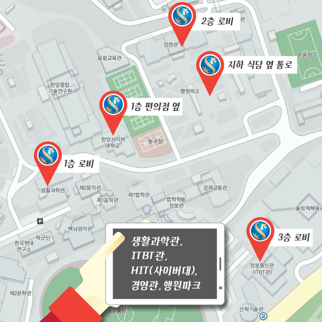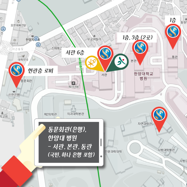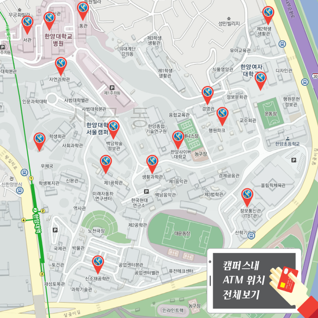 한양대 페이스북 계정에 메시지가 하나 도착했습니다. 바로 캠퍼스 내에서 이용할 수 있는 ATM 기기의 위치들을 알려달라는 것인데요~ 그래서 준비했습니다! 정확한 내용을 위해 은행측에 문의도 하고 학생들의 의견을 수렴해 위치 표시를 다음과 같이 해보았습니다. 나름의 대학생활 꿀팁 아닐까요?