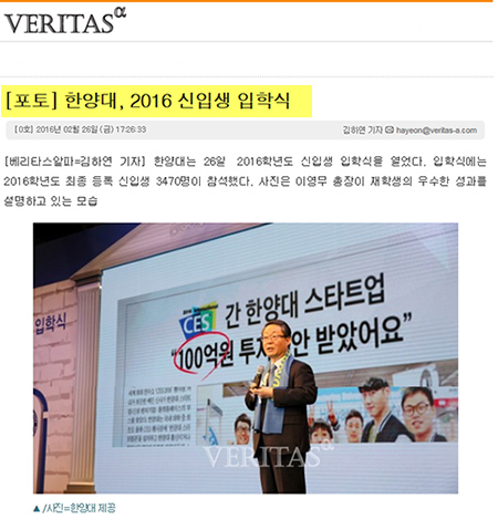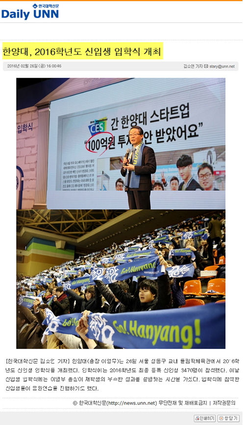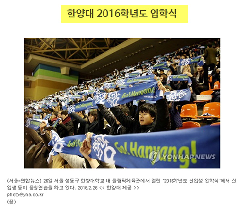 2월 26일 <연합뉴스>, <베리타스알파>, <한국대학신문>, <뉴시스>, <뉴스1>에서는 26일 한양대학교 내 올림픽체육관에서 열린 '2016학년도 신입생 입학식'에 대한 소식이 전해졌습니다. 이날 입학식에는 2016학년도 최종 등록 신입생 3470명이 참석하여 재학생 우수 성과 설명을 듣고, 응원연습을 하는 등의 시간을 가졌습니다.