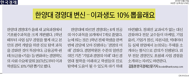 3월 7일 <한국경제>에서는 한양대 경영대가 변화하고 있다는 소식이 전해졌습니다. 경영대는 실무 경험과 경력 개발을 위해 올해 새 교육과정에서 기초필수과목을 크게 개편했고, 금융공학·핀테크 등 변화하는 경영학도의 사회 수요에 맞춰 2017년도부터 이과 학생들도 10%가량 뽑기로 했습니다. 이러한 변화 중 가장 눈에 띄는 것은 1학년 전체 학생을 강당에 모아 진행하는 '경영의 이해'강좌 수업인데요. 경영대 철학을 이해하고 학생들의 진로탐색에 도움이 될 수 있도록 하기 위해 마련됐습니다.
