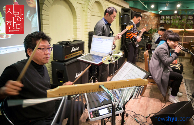 | ▲ 한양대학교 응원단 선후배들로 구성된 ‘루터스 OB밴드’가 85학번 동기회 출범식 공연을 위해 리허설을 진행하고 있다. | ||