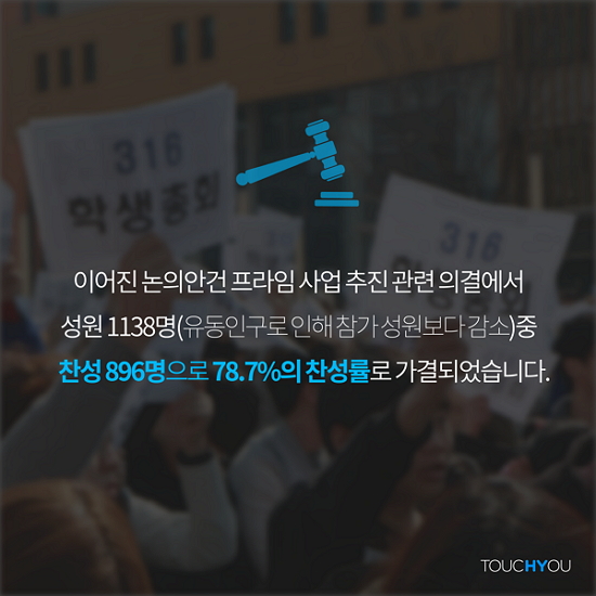 이번 프라임 사업 추진 의결은 3월 16일 캠퍼스에서 열린 학생총회에서 논의됐다. 구체적으로 프라임 사업은 성원 1138명 중 찬성 896명으로 78.7%의 찬성률을 보이며 가결됐다.