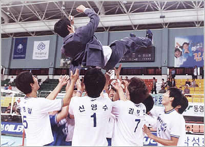 본교 배구부가 대학 최강의 자리에 다시 올라섰다. 2004 전국배구연맹전 3차대회에서 본교는 인하대를 세트 스코어 3대 0으로 꺾고 우승컵을 안았다. 지난 6일 김해 실내체육관에서 벌어진 결승전에서 강동진(체대·체육3), 신영수(체대·체육4) 선수가 40점에 이르는 대량득점을 하는 등 본교는 적극적인 공격을 펼치며 승리를 낚아챘다. 이로써 배구부는 2차 대회에 이어 배구연맹전 2연패에 성공함으로써 최근 1년간 부진한 성적으로 인해 쏟아지던 주위의 우려를 말끔히 씻어내게 됐다.