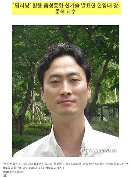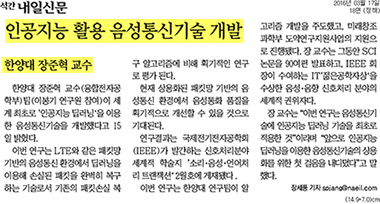 3월 15일과 17일 <내일신문>, <뉴스1>, <연합뉴스>, <베리타스알파>, <이데일리>에서는 장준혁 융합전자공학부 교수 연구팀이 세계 최초로 '인공지능 딥러닝'(Deep Learning)을 이용한 음성통신 기술을 개발했다는 소식이 전해졌습니다. 이에대해 장 교수는 "이번 연구는 음성통신기술에 인공지능 딥러닝 기술을 최초로 적용한 것"이라며 "앞으로 인공지능 딥러닝을 이용한 음성통신기술의 상용화를 위한 첫 걸음을 내디뎠다"고 말했습니다.