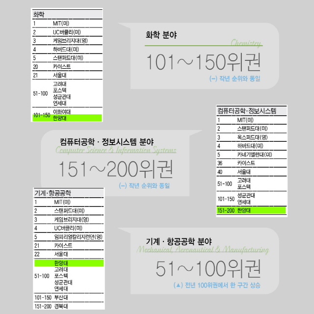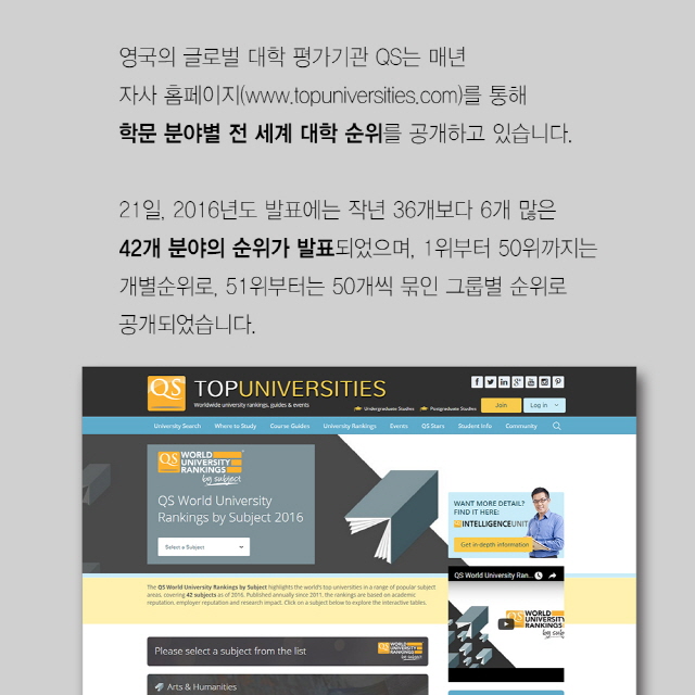 2016 QS 발표 학문분야별 세계 순위 … 200위 내 15개 분야에 이름 올려