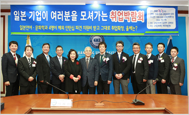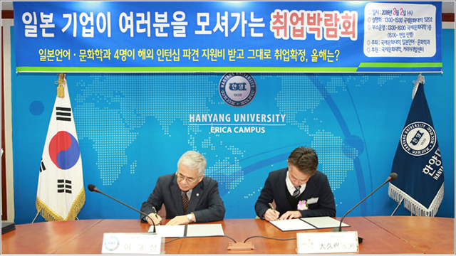 이른바 '취업 빙하기'라고들 한다. 기업들은 매해 채용 규모를 줄이거나 동결하겠다고 발표하는 추세다. 취업준비생들은 그 혹독한 관문을 뚫어야 하는데, 특히 인문계 학생들이 원하는 직종에 취업하기란 ‘하늘의 별 따기’다. 경기가 나아지더라도 이공계를 선호하는 현상이 쉽게 바뀔 것처럼 보이지는 않는다. 일본언어문화학과는 유능한 학생들조차도 취업이 어려운 상황을 타개하고자, 학과가 직접 취업 기회를 발굴하는 편을 택했다. ERICA캠퍼스 본관에서 지난 2일 개최된 일본기업 해외 인턴십 MOU 및 취업박람회는 그런 의미다. 일본의 11개 기업과 인턴십 관련 MOU를 체결, 학생들의 해외 실습 기회를 직접 확보한 것. 지난 2015년, 3개 기업에 4명의 학생을 파견한 본 프로그램은 올해 11개 기업이 참여해 기회를 늘렸다.