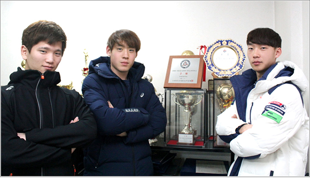 | ▲ 아이스하키부 감독 및 선수들과 지난 11일 우리대학 체육부실에서 인터뷰를 진행했다. 왼쪽부터 3학년 부주장 이승준(생활체육학과 3) 씨, 4학년 주장 최영일(생활체육학과 4) 씨, 4학년 부주장 이정엽(생활체육학과 4) 씨. | ||
