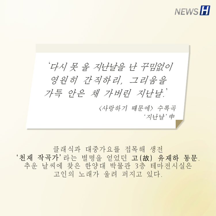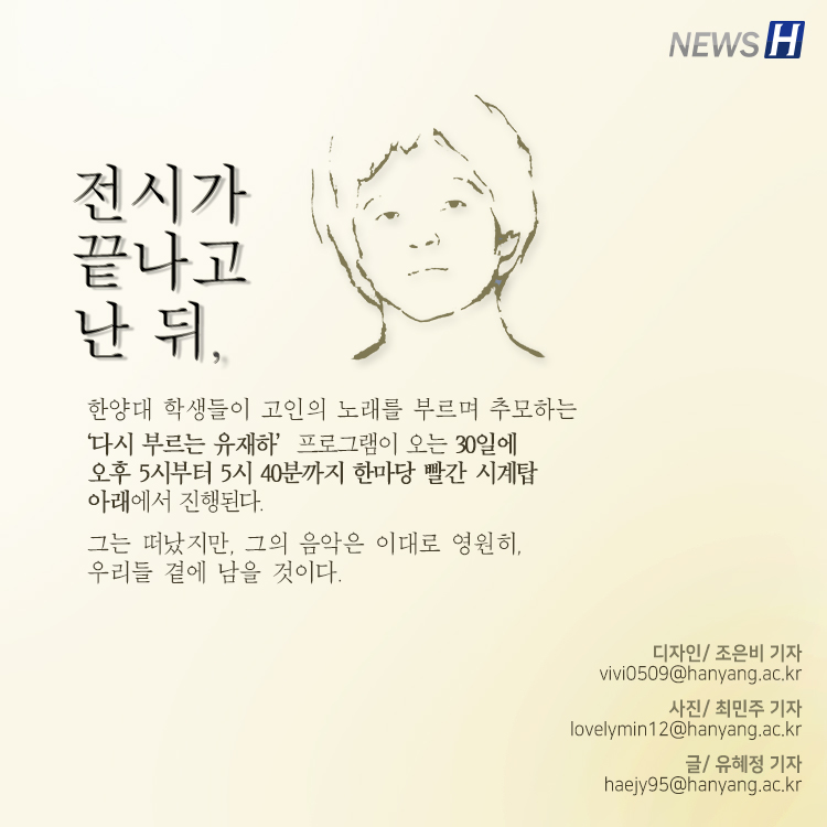 유재하 30주기 추모전시회 <우리 이대로 영원히, 유재하> ▲ 카드뉴스의 원본 기사는 아래에서 읽을 수 있습니다- 입동과 함께 찾아온 유재하의 목소리▲ Click to read the English article- What Will We Leave Behind 관련기사 유재하 동문 33주기 … 올해 음악경연대회는? 한양대의 새로운 공식 응원가 '가리워진 길'의 제작 현장 속으로! 조은비 gad2226@naver.com 다른기사 보기 저작권자 © 뉴스H 무단전재 및 재배포 금지 당신만 안 본 뉴스 [포토스토리] "AI 시대 해답은 브랜딩", 오세훈 서울시장의 경영학 특강 현장 Into the Creation 2025, 창작자들의 꿈에 날개를 이찬규 학생, 사이버·우주 융합연구로 2025 사이버안보논문공모전 대상 수상 한양대, '2026 QS 지속가능성 순위' 세계 161위, 국내 4위 기록 해커톤에서 인턴십까지, 현대차 사내 스타트업에 다녀오다 [창업지원단 인턴십 경험기] [포토스토리] 한양 속에 사회혁신을 품다, SSIR 먼슬리 콜로키움 현장 행복은 좋은 경험의 ‘빈도’에서, 서은국 교수와 함께한 한양인의 힐링콘서트 현장 [포토스토리] "AI 시대 해답은 브랜딩", 오세훈 서울시장의 경영학 특강 현장 댓글삭제 삭제한 댓글은 다시 복구할 수 없습니다. 그래도 삭제하시겠습니까? 비밀번호 닫기 기사 댓글 0 댓글 접기 로그인 후 이용 가능합니다. 댓글 내용입력 비회원 로그인 이름 비밀번호 댓글 내용입력 댓글쓰기 계정을 선택하시면 로그인·계정인증을 통해 댓글을 남기실 수 있습니다. 회원 로그인 비회원 글쓰기 이름 비밀번호 자동등록방지 로그인 옵션 창닫기 기획기사 [포토스토리] "AI 시대 해답은 브랜딩", 오세훈 서울시장의 경영학 특강 현장 Into the Creation 2025, 창작자들의 꿈에 날개를 해커톤에서 인턴십까지, 현대차 사내 스타트업에 다녀오다 [창업지원단 인턴십 경험기] [포토스토리] 한양 속에 사회혁신을 품다, SSIR 먼슬리 콜로키움 현장 행복은 좋은 경험의 ‘빈도’에서, 서은국 교수와 함께한 한양인의 힐링콘서트 현장 [카드뉴스] '한양대학교 SDGs? 알고 보니 내 일상 속에 있었다!' 1편