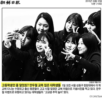 4월 2일 <조선일보>에서는 만우절 이벤트로 유행하고 있는 '고교생 추억 놀이'를 하고 있는 한양대 학생들의 모습이 전해졌습니다. 고교 동창인 이들은 만우절을 맞이해 고교 시절 입었던 교복 차림으로 기념사진을 찍으며 즐거운 시간을 보내고 있습니다.