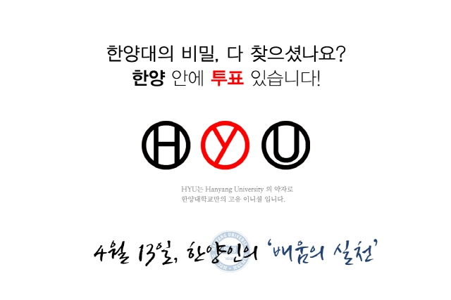 제20대 국회의원 선거를 하루 앞두고 한양인들의 투표를 독려하는 이미지를 소개합니다. 이 이미지에는 한양대만의 비밀(?)이 숨어 있다는데... 과연 한번에 찾아낼 수 있을까요? 우선 보시죠.