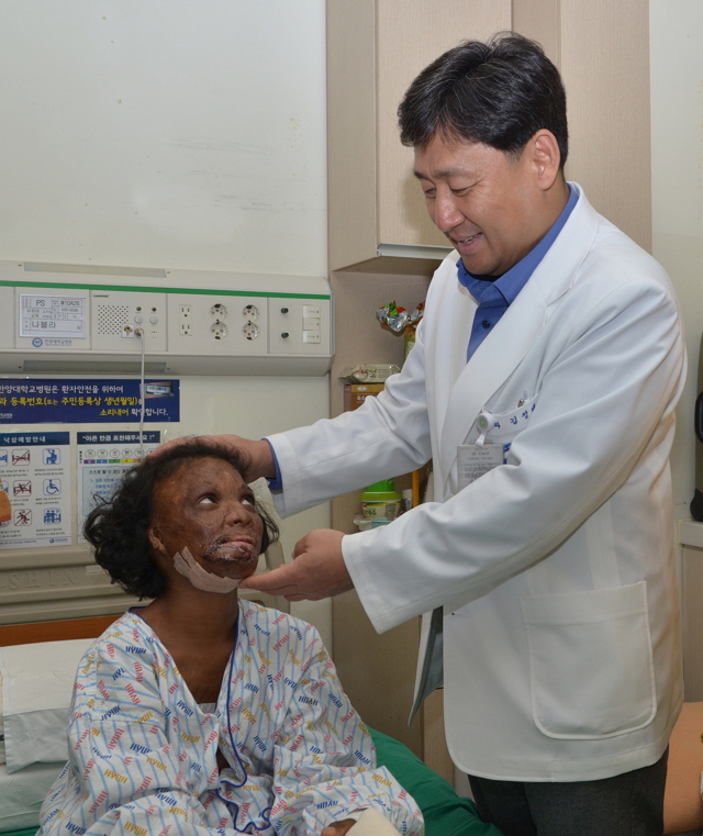 | ▲ 얼굴, 가슴, 양손 등 전신에 화상을 입은 14살 스리랑카 소녀 로쉘(사진 왼쪽). 김정태 한양대병원 성형외과 교수(사진 오른쪽)에게 재건성형을 받고 현재 본원에서 회복과정 중에 있다. | ||