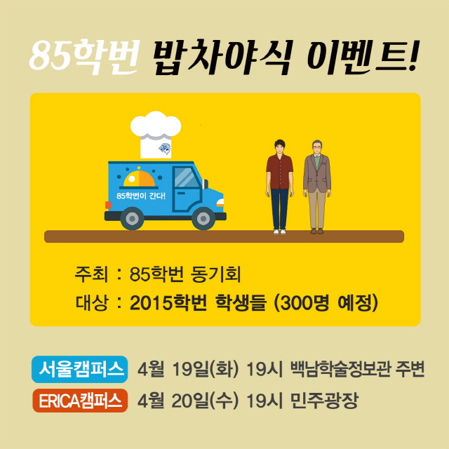 한양대 85학번 동문들이 후배들을 위해 푸드트럭을 운영한다. 이번 푸드트럭 운영은 85학번 선배들이 후배들에게 ‘열심히 공부하라’는 격려를 전하기 위해 마련된 것으로 알려졌다.